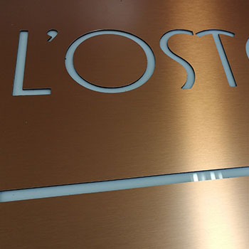 L'enseigne est faite avec un cadre en acier, un panneau en aluminium sculpté ou façonné avec une fraise CNC. Le logo et les lettres sont "sculptés" en aluminium, une feuille est insérée au dos en plexiglas opale pour diffuser la lumière et à l'intérieur de la plante est en led pour l'éclairage nocturne.